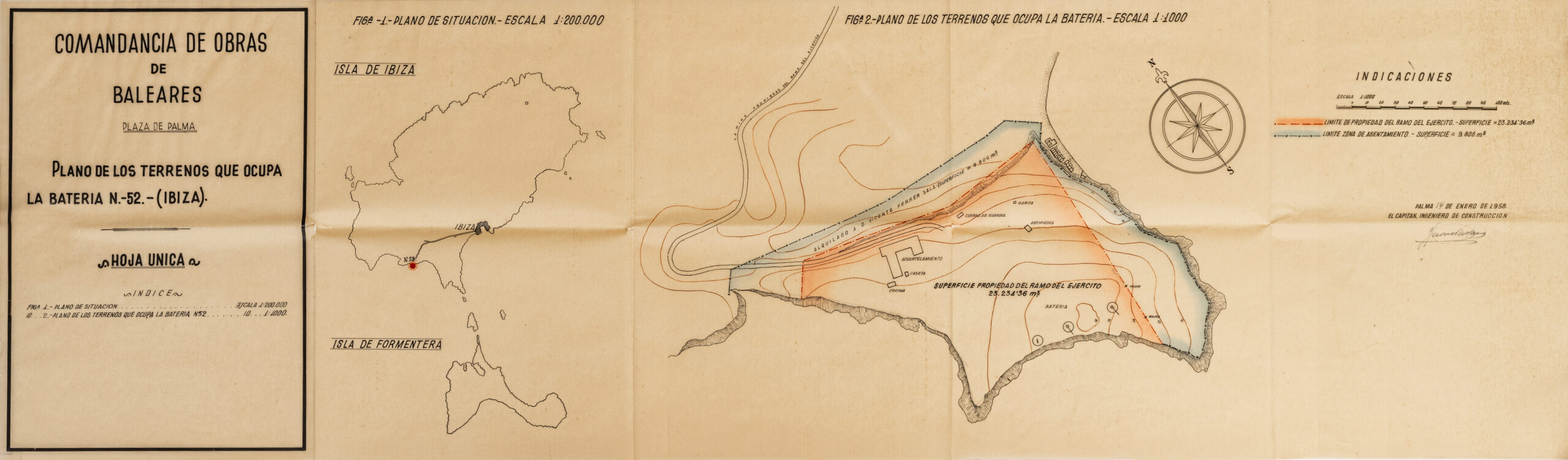 Plano del terrenos que ocupa la batería N.º 52 de Ibiza. Comandancia de obras Baleares, Plaza de Palma. Archivo Intermedio Militar de Baleares